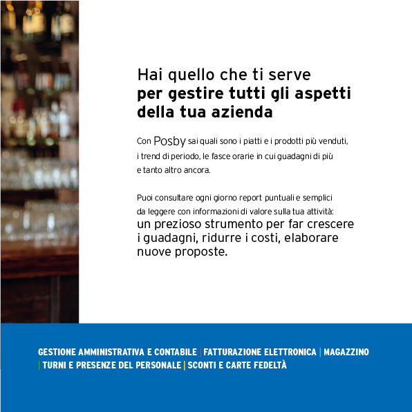 Grazie a Posby è possibile gestire tutti gli aspetti della propria attività, dal magazzino alle vendite, senza dimenticare la possibilità di prendere le comande da palmari e dispositivi mobile, mettendo in comunicazione diretta la sala con la cucina.